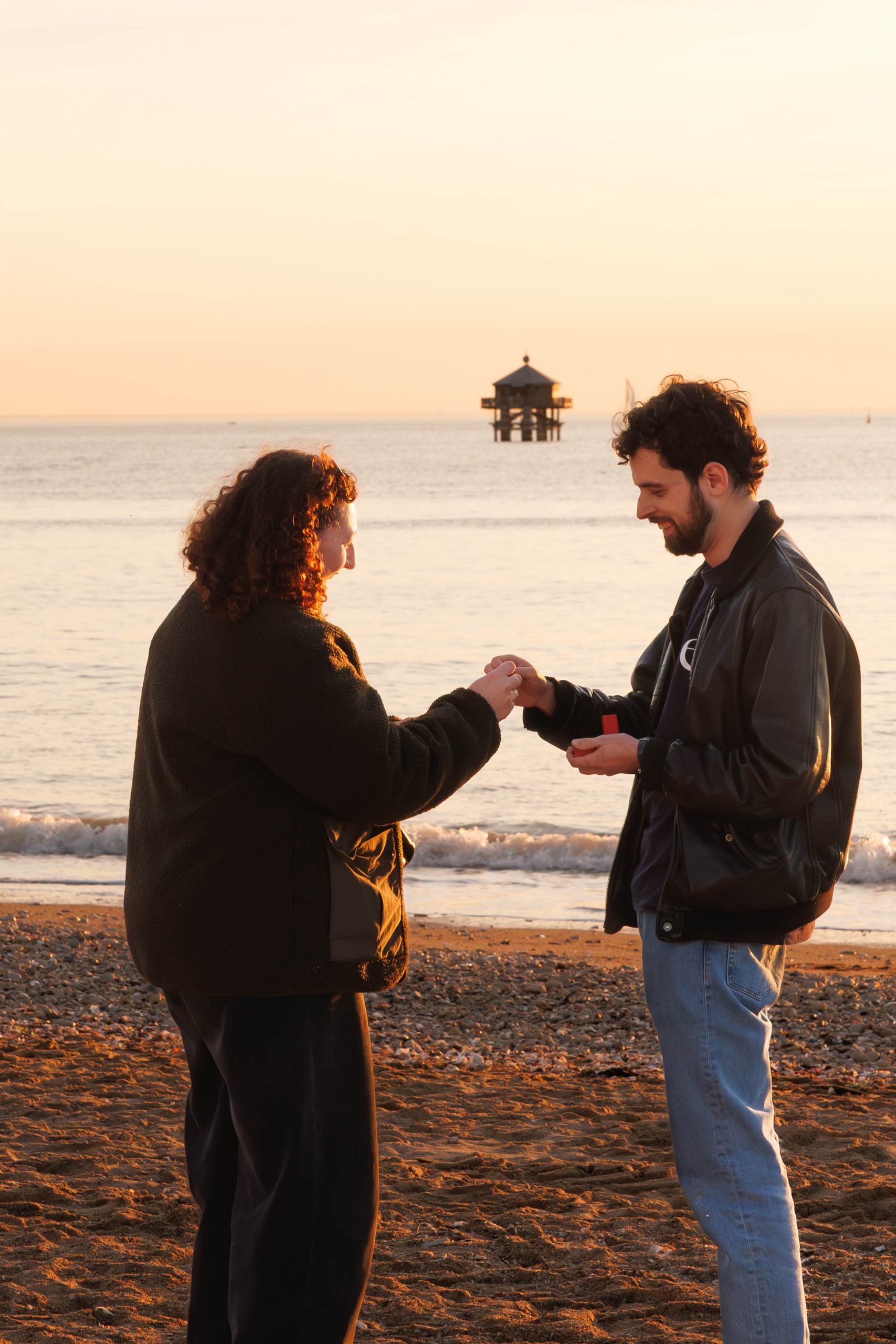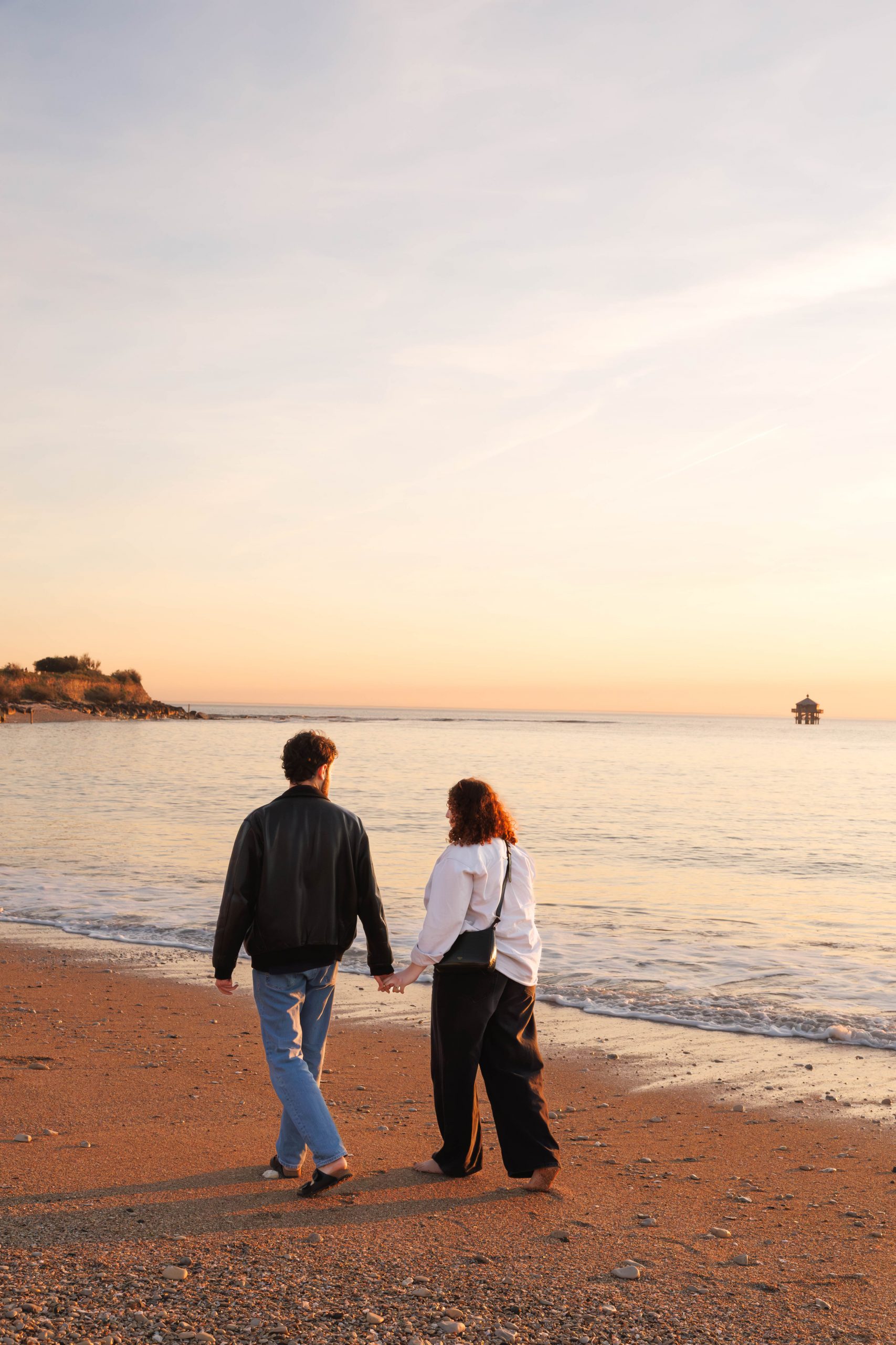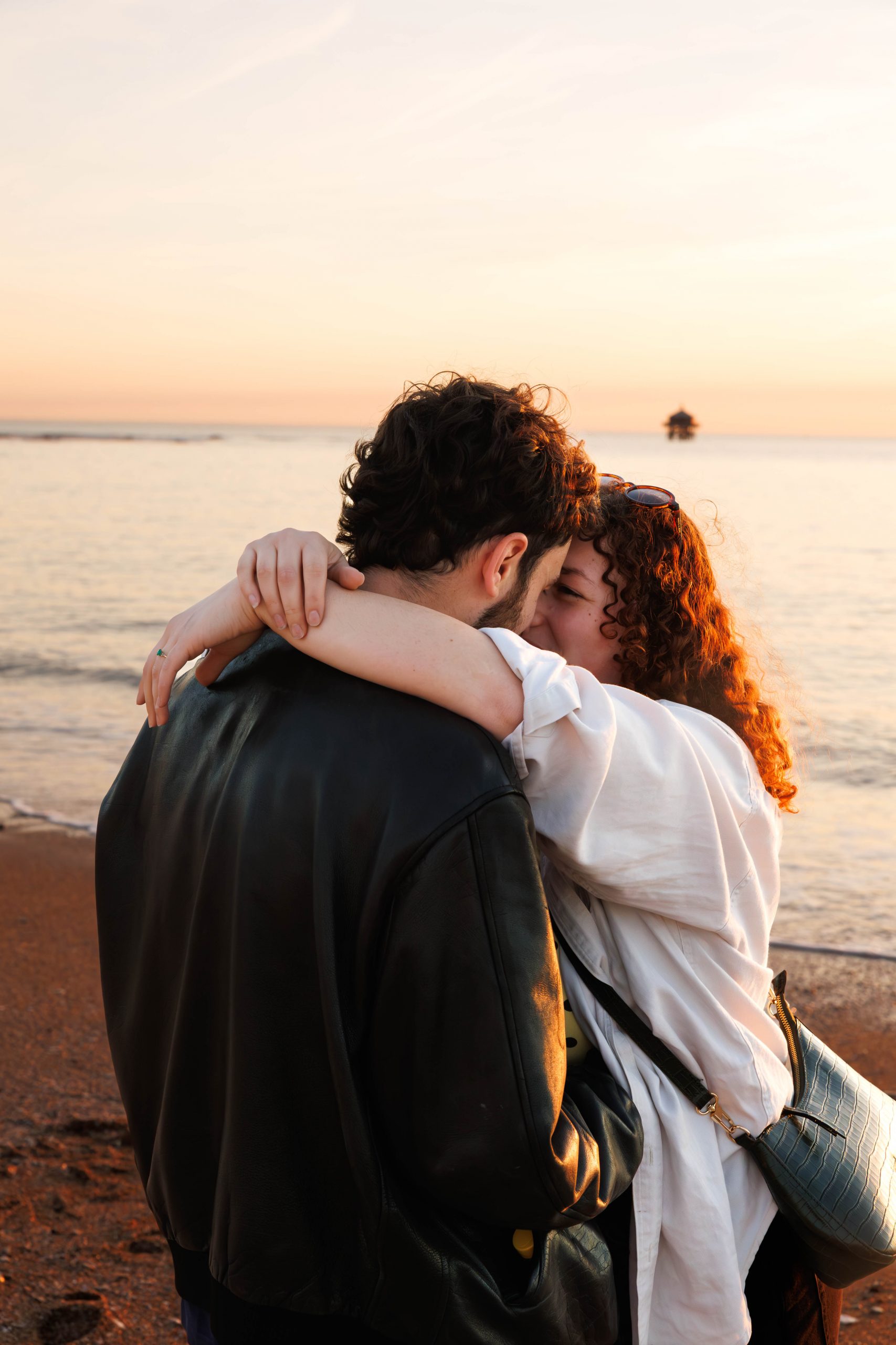 J’ai reçu un message de Pierre un vendredi pour le lendemain (oui oui), en me demandant si je serai disponible pour photographier sa demande en mariage au coucher de soleil sur une plage de La Rochelle ! J’ai bien sûr dis oui directement et nous avons planifié tout ça. Il voulait une demande simple, à leur image, les pieds dans le sable, avec une douce lumière mais surtout : créer un réel effet de surprise. J’ai alors du les suivre discrètement avec mon appareil photo pour ne pas éveiller les soupçons et capturer ce moment unique. J’ai adoré !